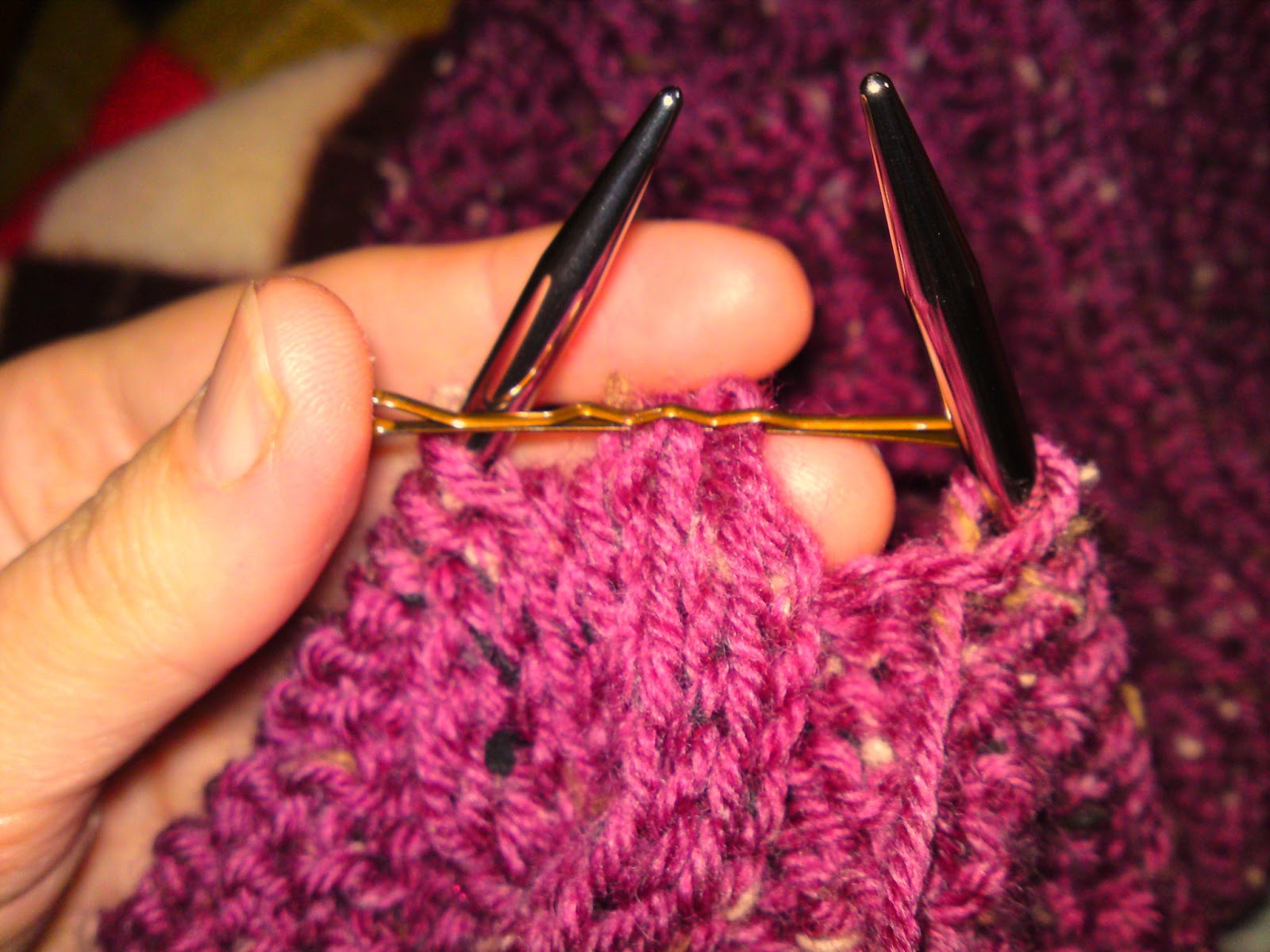 mas também o meu fiel amigo nos torcidos ! Agarra as malhas, não ocupa muito espaço enquanto tricoto, é levíssimo e consegue voltar à sua função inicial (prender uma madeixa rebelde de cabelo;o). Já experimentei clips meio abertos, alfinete de dama, mas de todas as formas esta é a minha favorita !