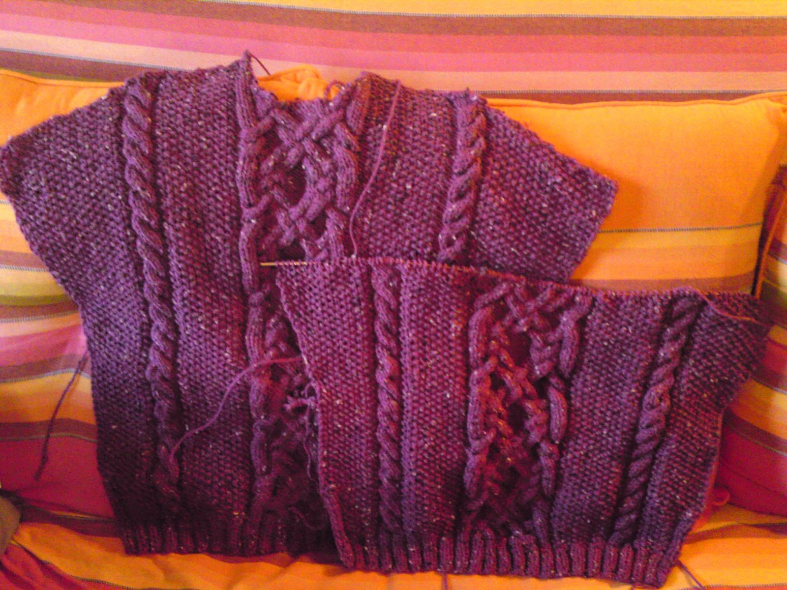 eheheh é engraçado que este trabalho não me aborrece muito. Em outros trabalhos tem alturas que enquanto é novidade parece que dá mais pica, quando se tem que repetir o mesmo já chateia um pouco mas com esta peça não. Ainda à bocado ia tendo um 'ataque' quando vi que um dos torcidos estava mal e só reparei quando já tinha avançado a peça em altura, valeu-me a agulha de crochet e a minha santa paciência para desmanchar várias carreiras das 3 malhas em questão e corrigir a troca que fiz nos torcidos. Quero muito chegar às mangas que são do mais 'chato que há': um rectângulo para cada uma ;o)