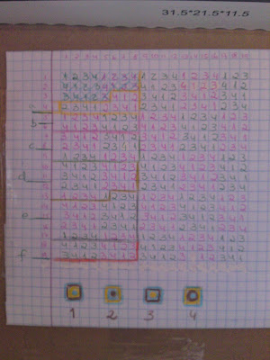 ontem lá engendrei uma caixa de sapatos e fiz um 'organizador' de squares, que eu tenho alturas que eles me parecem todos iguais e como optei por um padrão que assentasse em 3 cores e sendo que azul seria o do contorno dos squares fiquei sujeita apenas a um padrão de 4 quadrados a repetir mas de forma deslocada, na diagonal. Para me disciplinar vou fazendo por metas, só uno os squares quando tiver feito todos os necessários para cada meta, e cada uma tem um nr de squares sempre a crescer e à medida que os faço vou registando no esquema e depois uno-os no devido lugar, já me calhou unir o errado e ter de desmanchar (chato) ou de ter mais squares feitos de um padrão do que do que preciso para ir unindo.