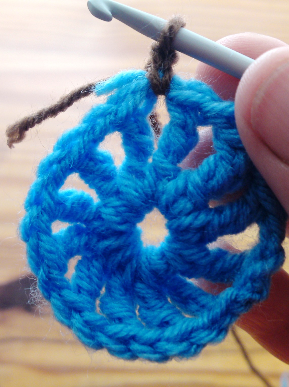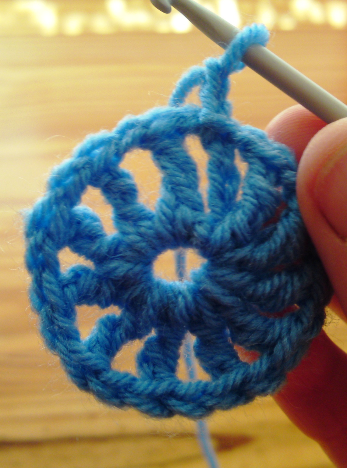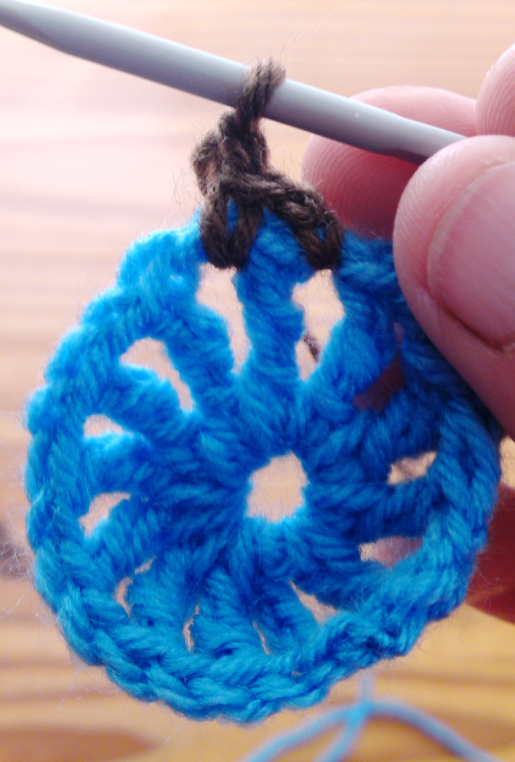 | 19) fazendo sempre uma corrente entre cada ponto alto duplo do círculo azul |