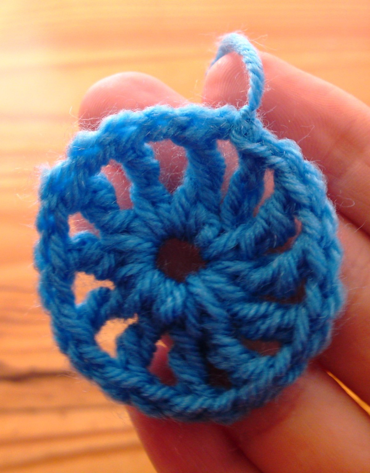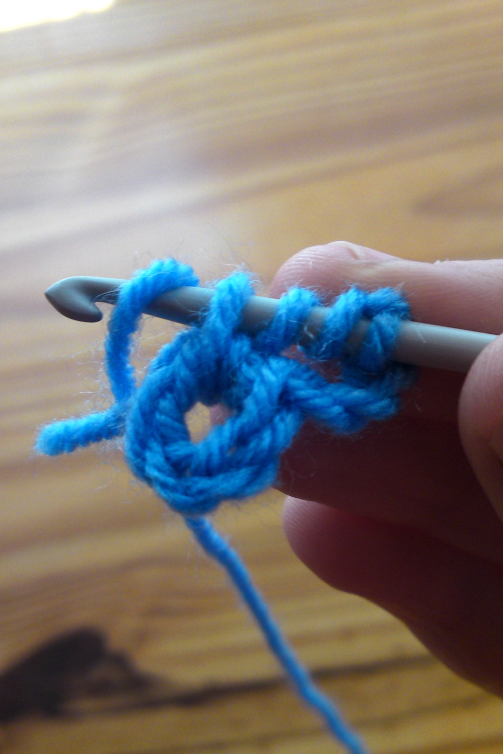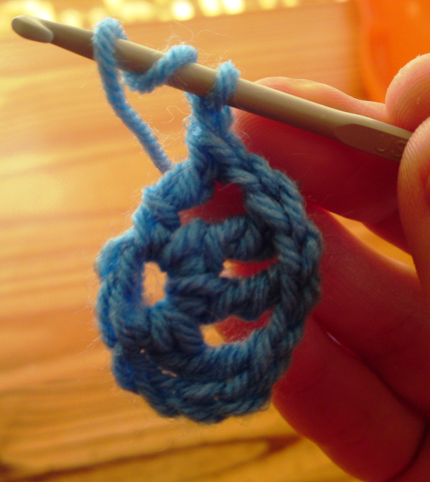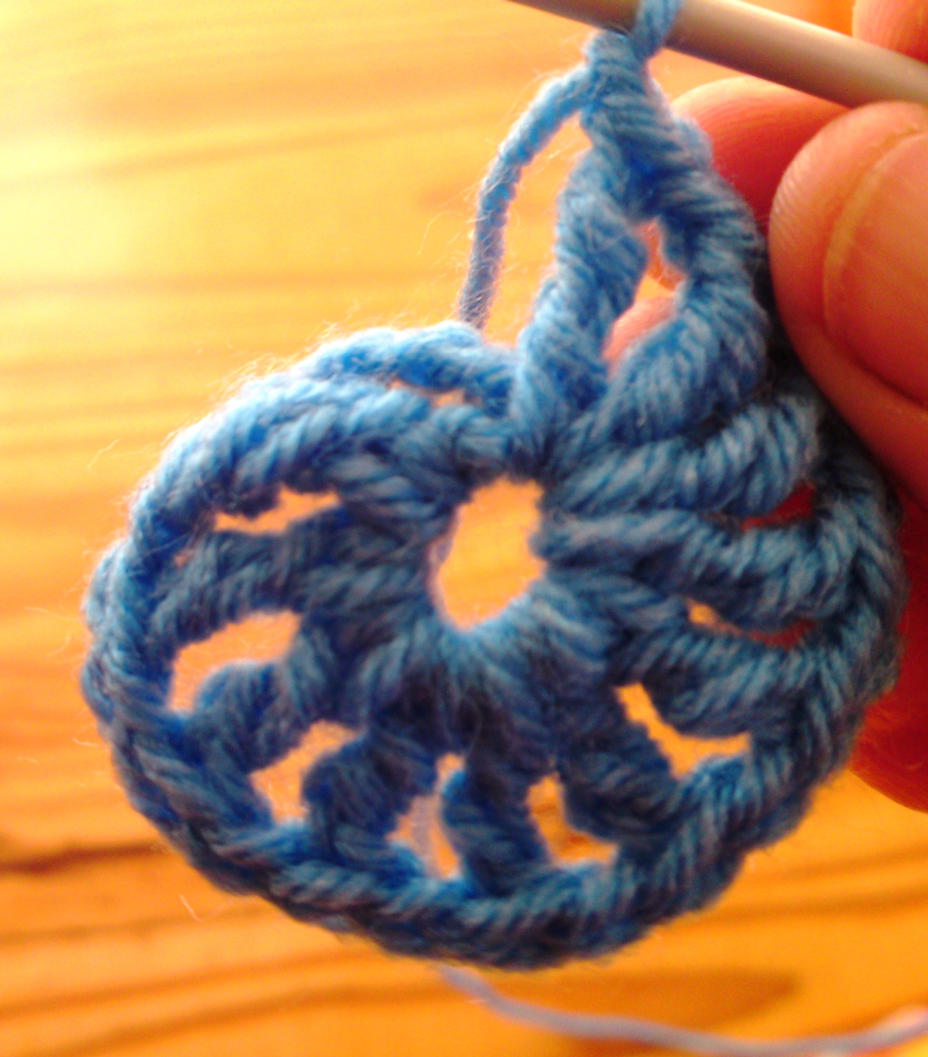 | 7)...passar a agulha por dentro do círculo, apanhar uma laçada e fechar o 2 pontos seguintes |