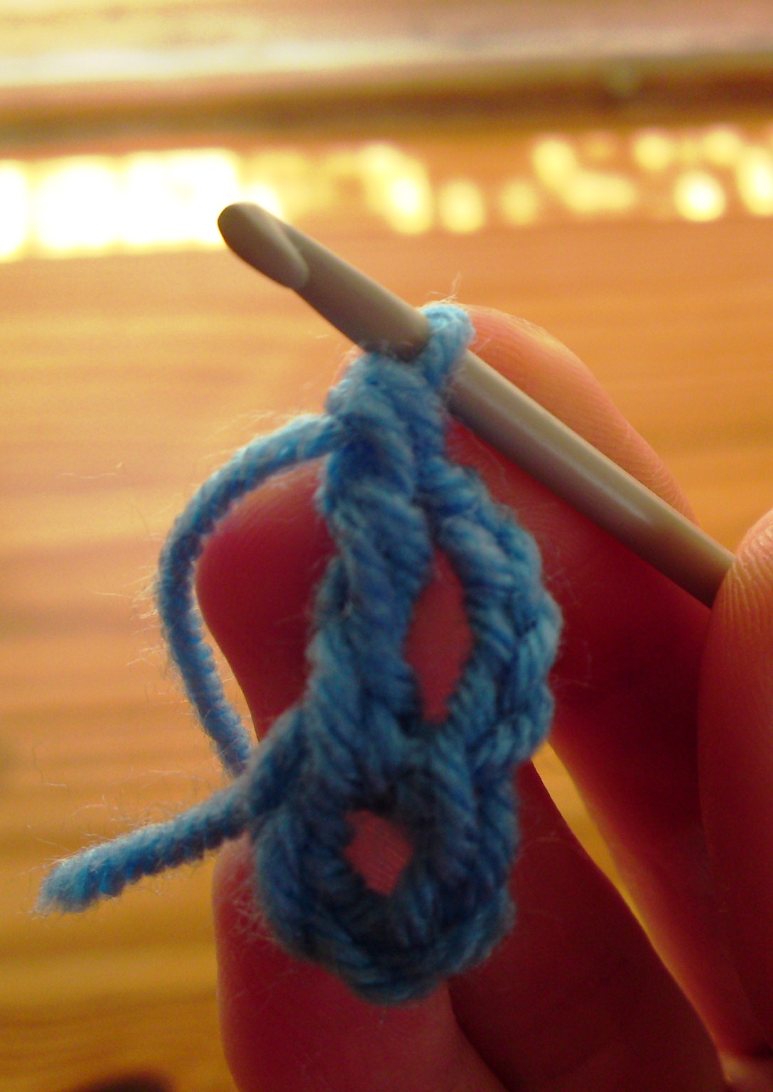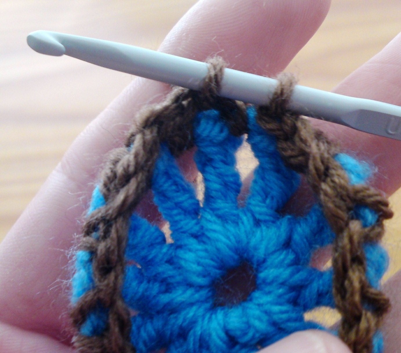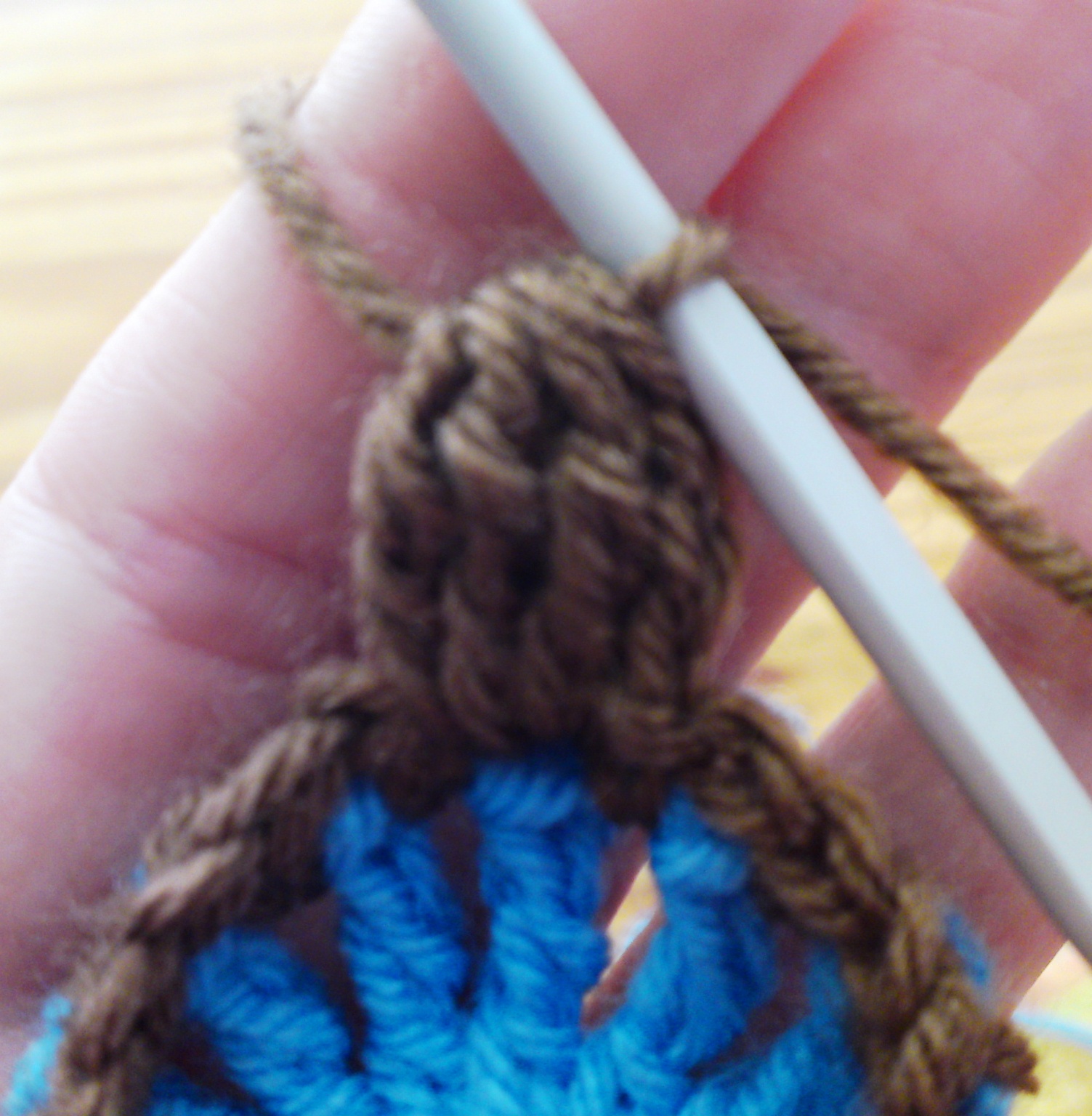 | 7)...passar a agulha por dentro do círculo, apanhar uma laçada e fechar o 2 pontos seguintes |