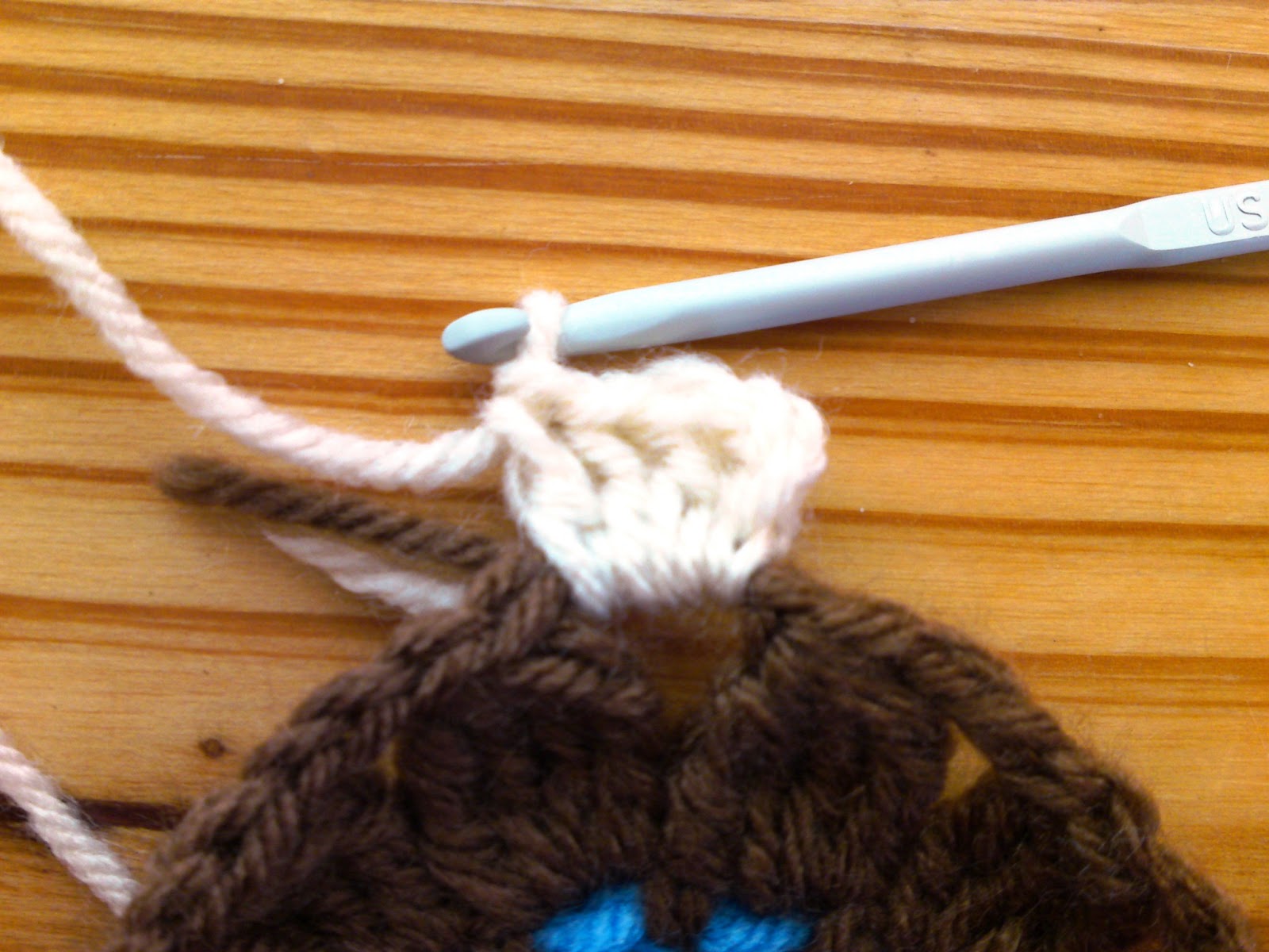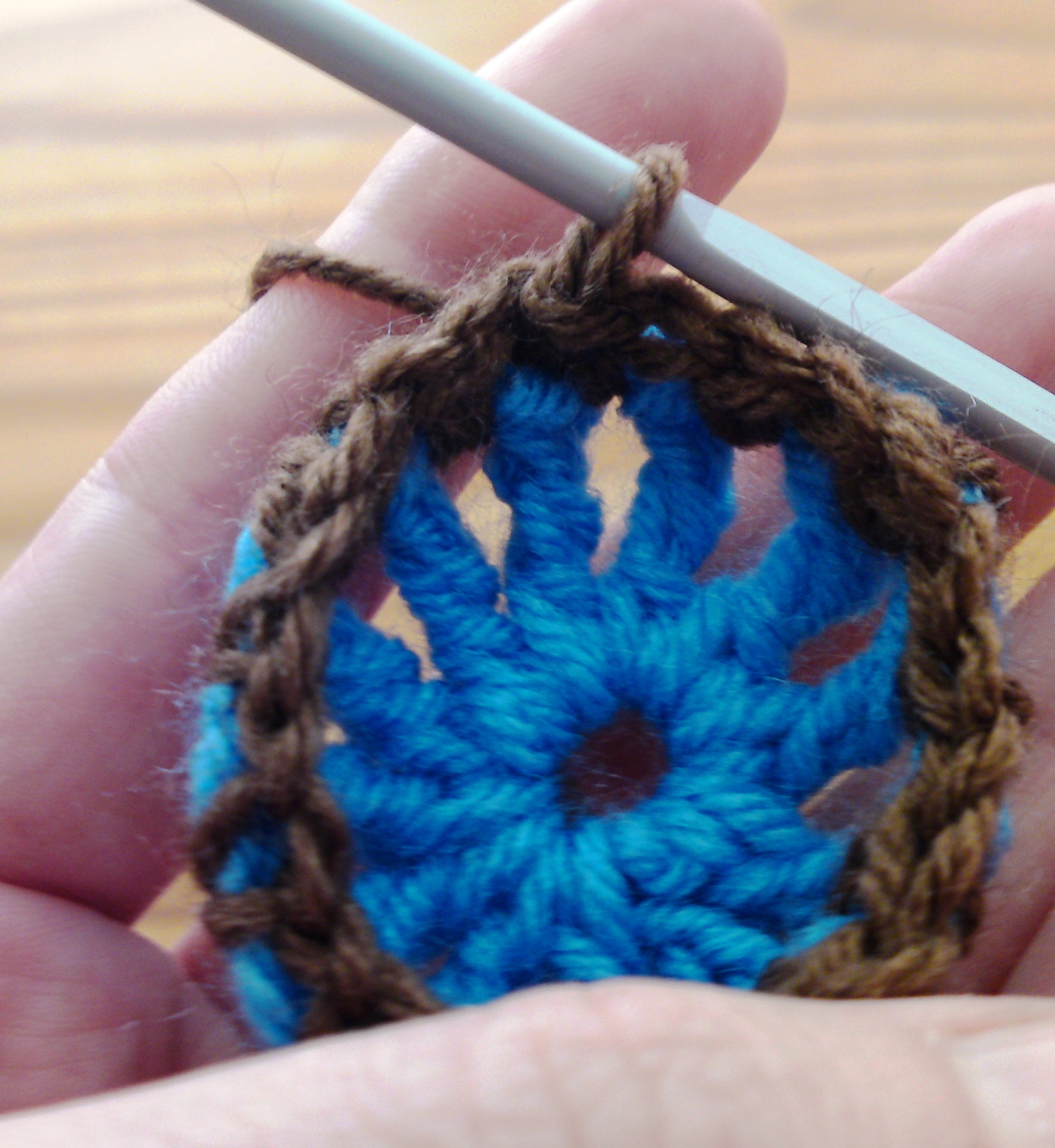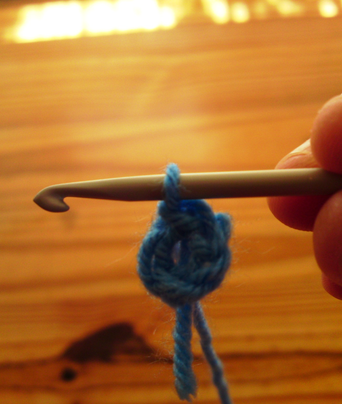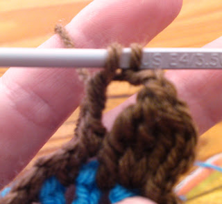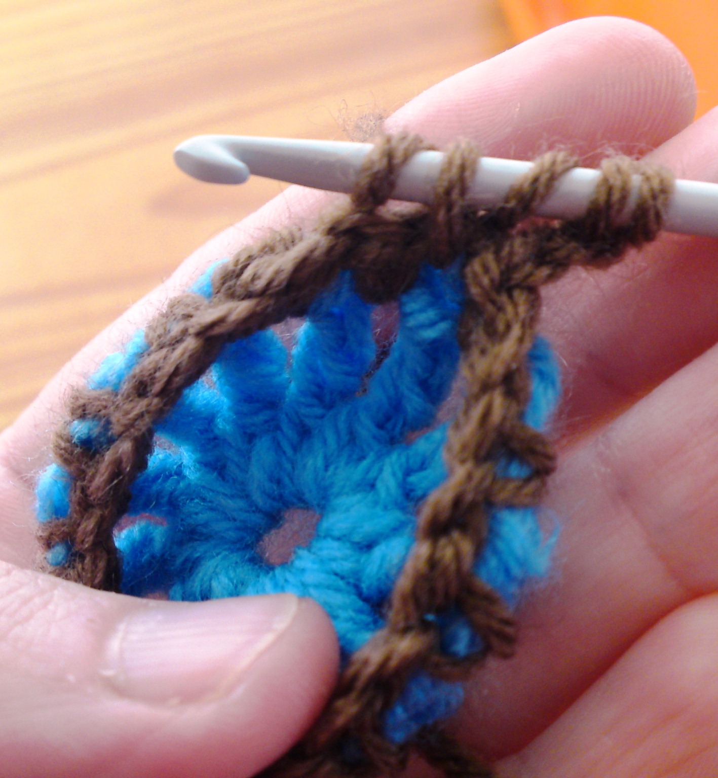 | 7)...passar a agulha por dentro do círculo, apanhar uma laçada e fechar o 2 pontos seguintes |
