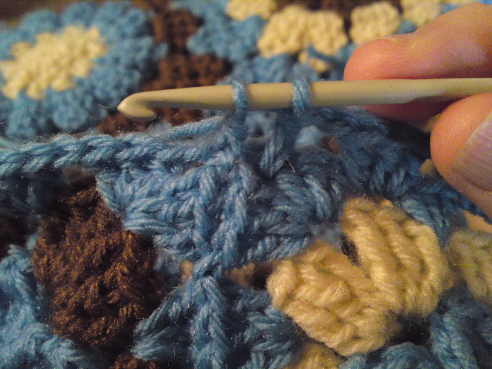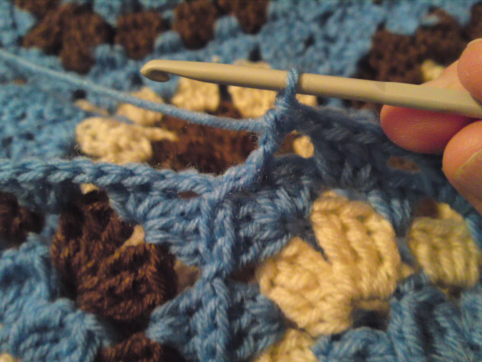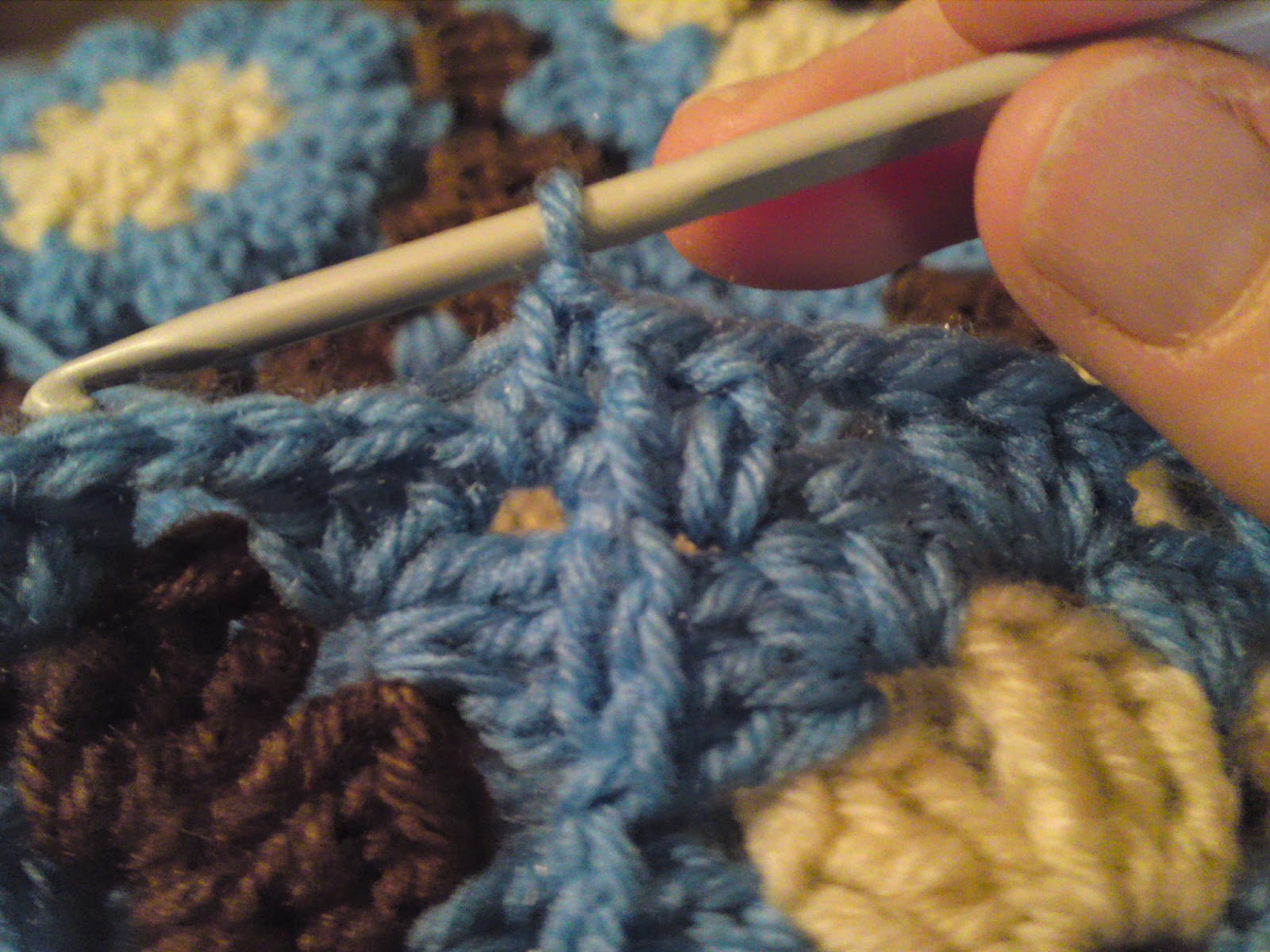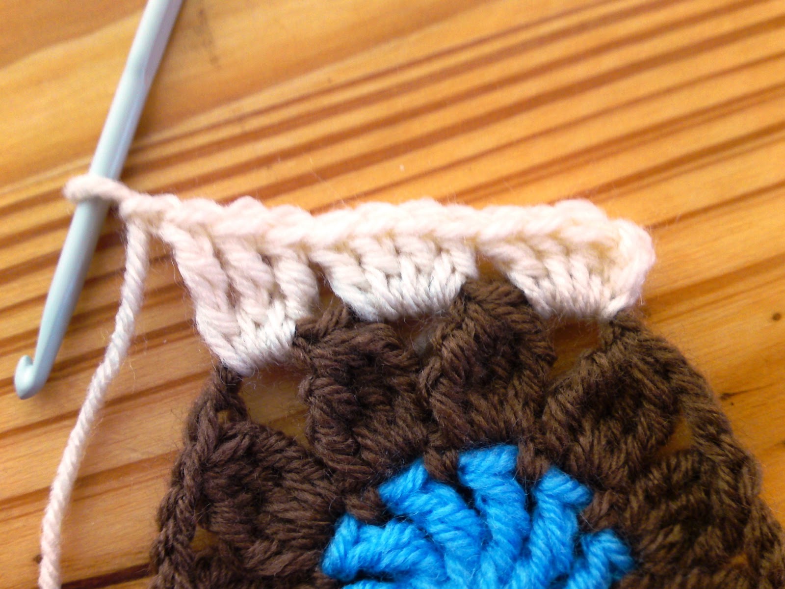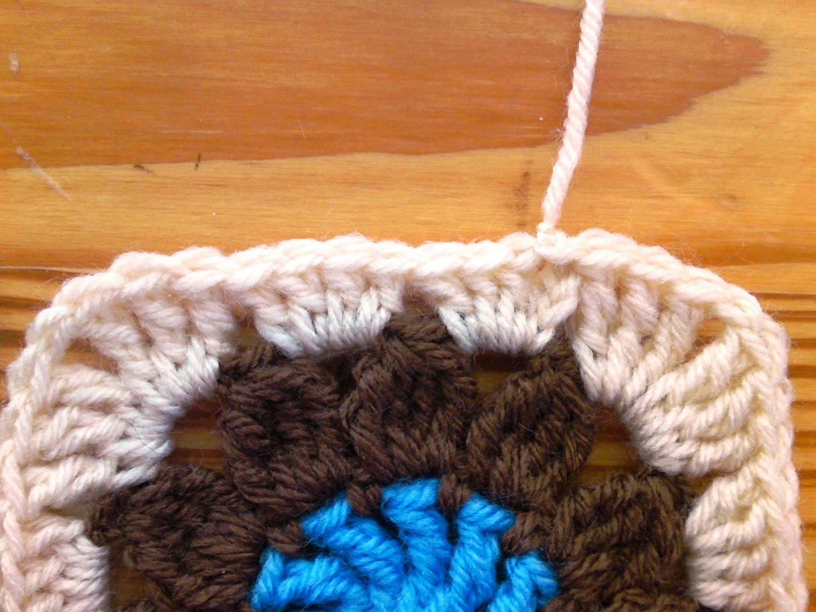Na 4ª carreira começei sempre antes do canto e os cantos apenas têm uma corrente. Na união dos quadrados fiz uma outra carreira no join-as-you-go e com 2 correntes nos cantos.
