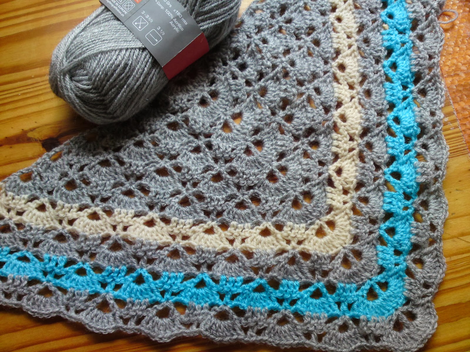 Tenho estado a adorar fazer a echarpe cinza com carreira bege e azul (este últimos são novelos que me sobraram de outros trabalhos: o bege da minha colcha de granny squares e o azul do meu poncho). O esquema é muito fácil de memorizar e à 5 carreira já não precisava de esquema ;o)