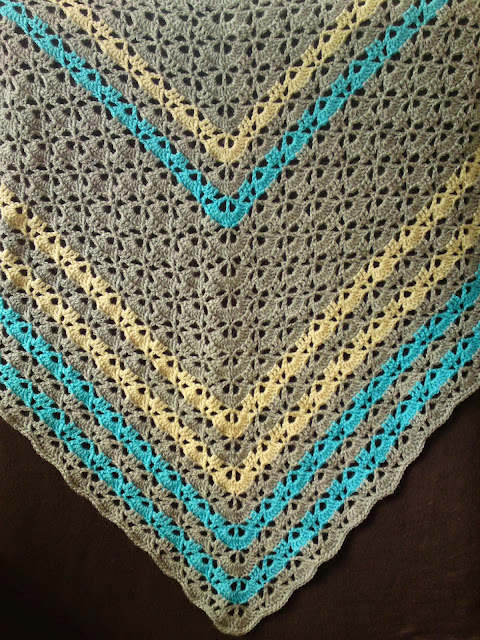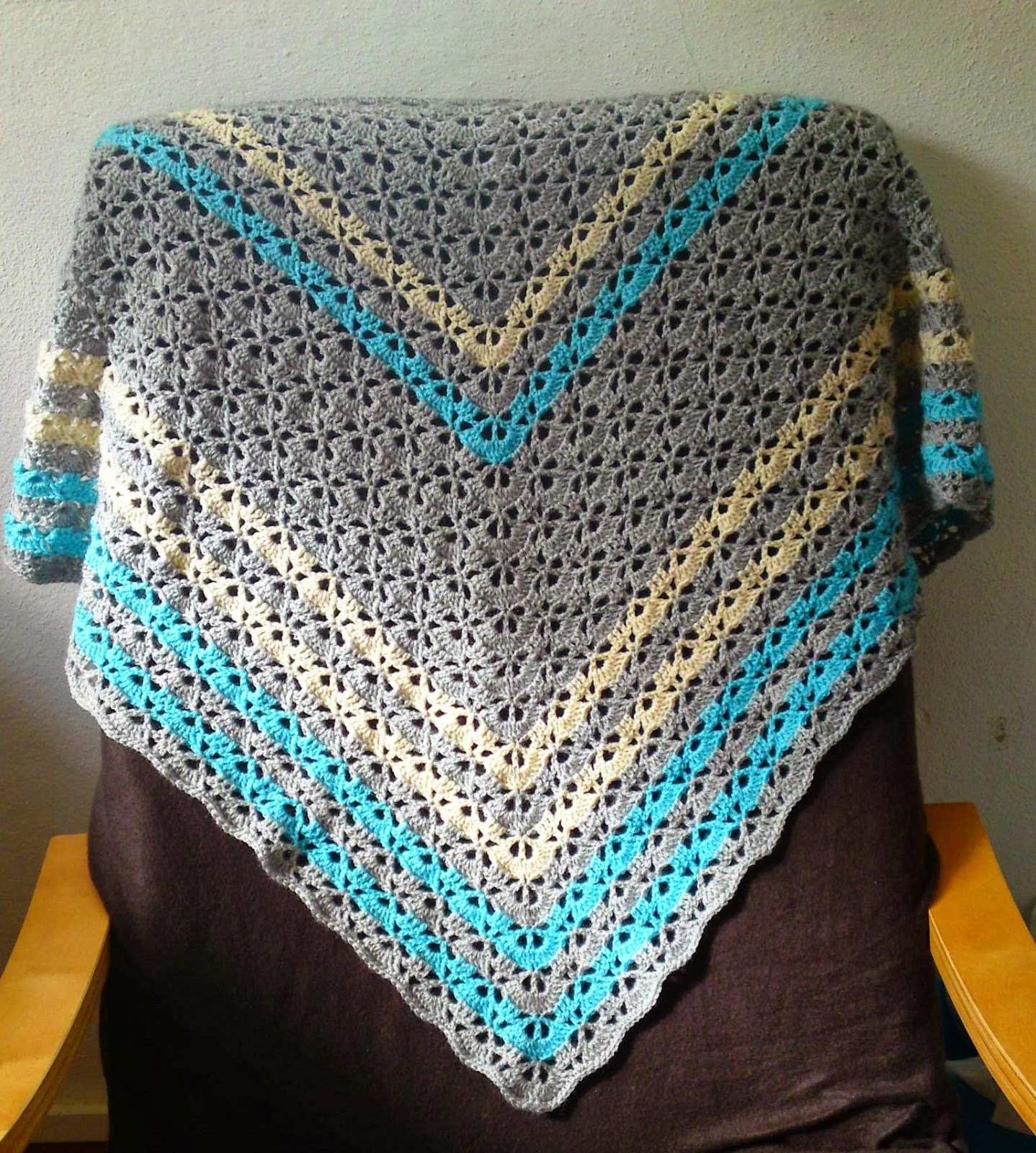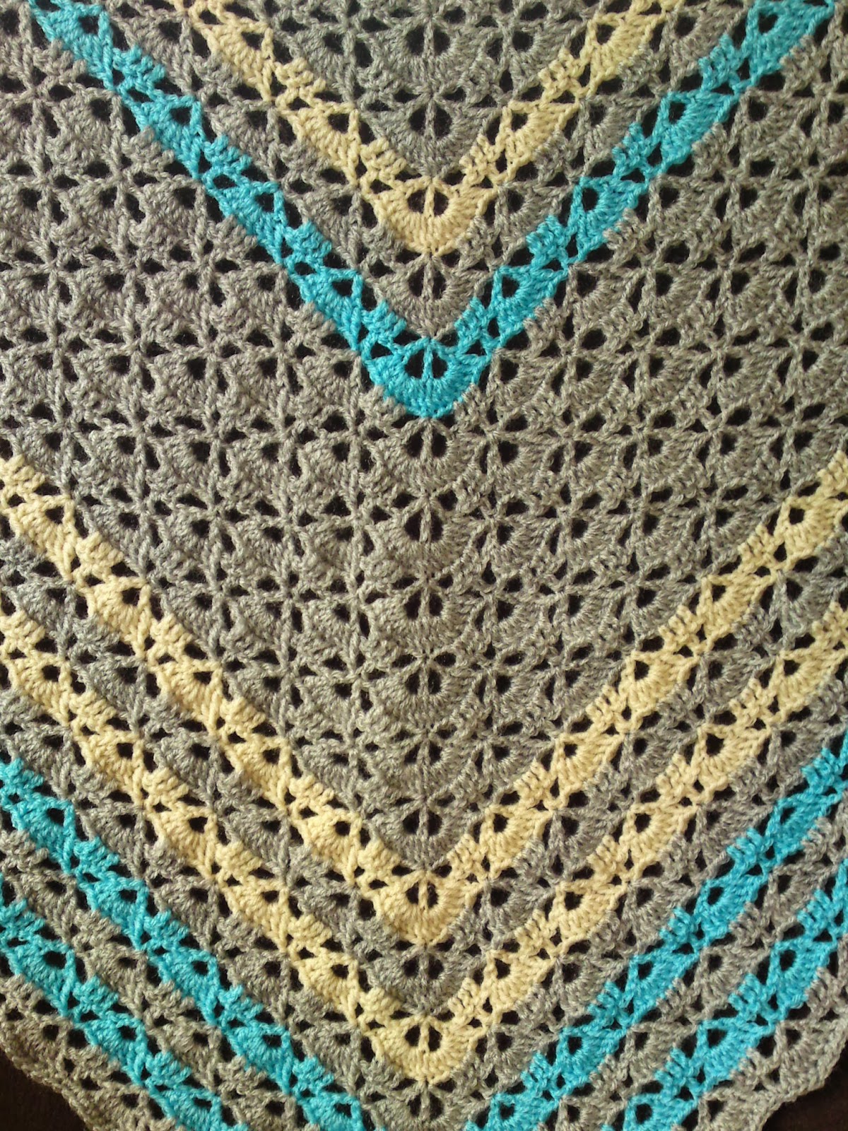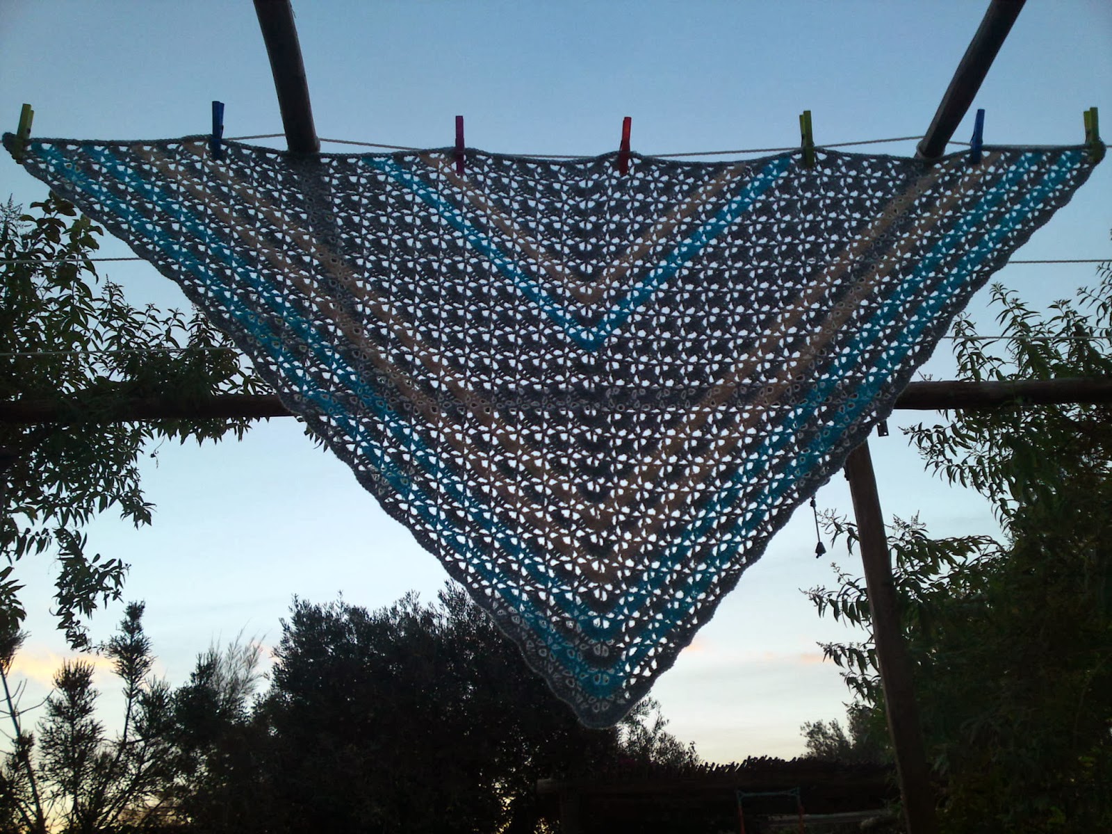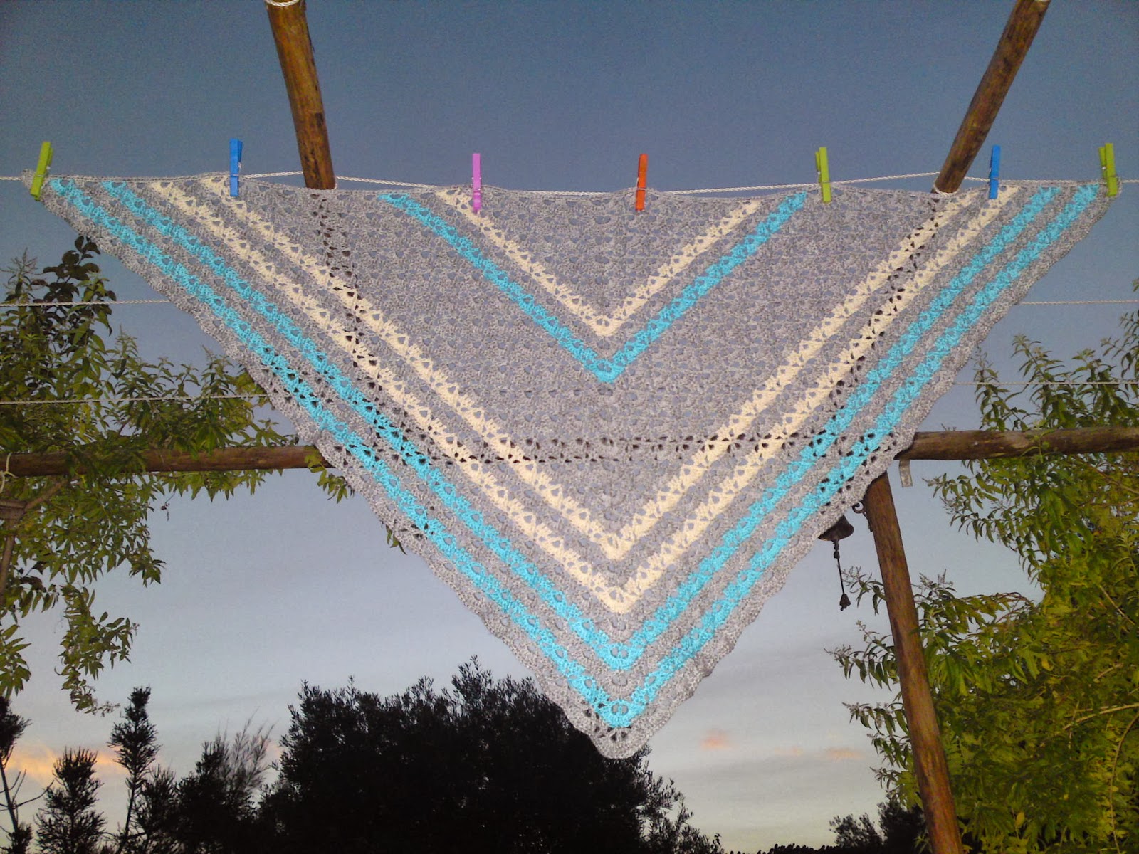 Terminei a echarpe, que mais se parece com um xaile, eu sei, mas é muito versátil para usar, o que não acontece com os xailes mais pesados. Ficou com 1,50 m x 75 cm e gastou muito pouca lã. Usei 2 novelos (50g cada) já encetados de azul turquesa (que tive de comprar para acabar o meu