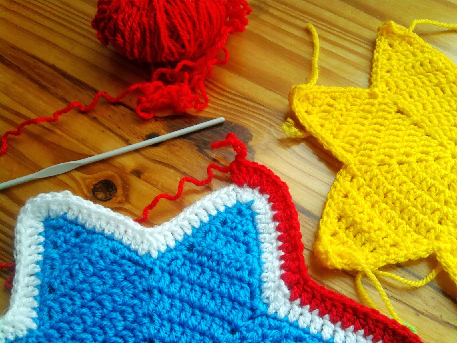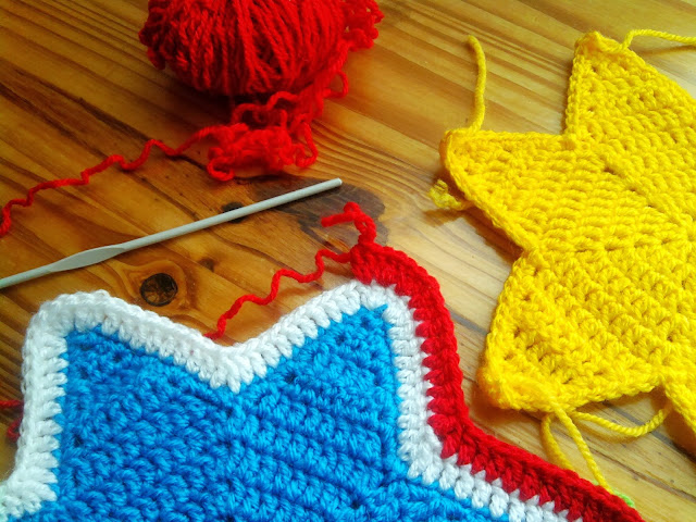 Hoje acordei com vontade de pegar na colcha de estrelas que planeei para o meu filho, nunca passou dos 1ºs testes de estrelas e esteve guardada até hoje (no entanto dei uso ao esquema e fiz uma mala e com o esquema incompleto, sem as pontas, um barco de pendurar). Recentemente tinha comprado o verde que me faltava para poder iniciar a colcha e hoje foi a cor escolhida para começar, já que tinha estrelas de todas as cores: vermelho, amarelo e azul. Pois bem, depois de acabar a estrela verde verifiquei que as estrelas tinha tamanhos diferentes, depois constatei que deveu-se à escolhas da espessura das agulhas, não me recordava que tinha usado a 3mm nas primeiras experiências e que na estrela verde estava a usar a 3,5mm. pessoalmente prefiro a 3.5mm. Sendo assim tinha 3 estrelas feitas com agulha 3mm e 1 verde com a de 3,5mm e sinceramente preferi abdicar das estrelas feitas com 3mm e dedicar-lhes outro projecto. Acabei por desmanchar a vermelha e mantive a azul e amarela. Sairá uma almofada-estrela para fazer conjunto com a colcha, mas farei com riscas de cores à volta da estrela e assim reato o 'namoro' com este projecto mas sob a forma de uma almofada, e espero poder concretizar a colcha brevemente.