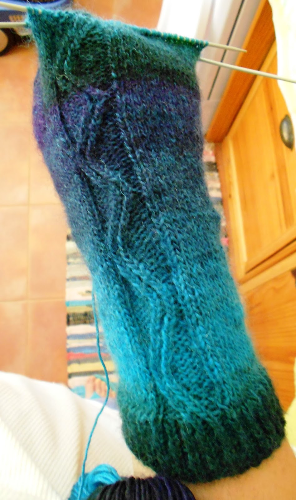 nasce uma meia que estimo ser oferecida em Setembro, altura da aniversariante. Esteve parada por uns tempo, retomei, parei e vou continuando neste pára arranca que ainda assim faz crescê-la. Já passei pelo calcanhar, agora estou nas diminuições para a planta do pé, daqui aos dedos é um saltinho, a ver se não faço render demais o fim desta meia, já que para o par terminar ainda me falta outra igual. A foto ficou desfocada mas a bateria apenas deu para tirar esta... e para não adiar, mais vale assim mesmo, de certa forma é um estimulo para mim publicar o que adianto ou não. Falando em tempo, ele mantém-se igual para estas lides das agulhas ainda para mais com um pequeno de 8 meses que já rebola e gatinha ;o)