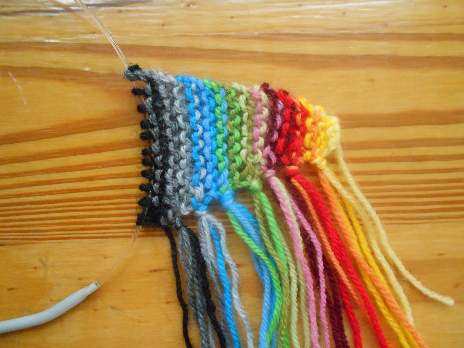É uma boa solução para um stock de lãs que é só de sobras pequenas pois cada cor á vista é feita de 2 voltas em meia. Eu tinha sobras de fios algumas com 1 palmo de comprimento por exemplo e serviu perfeitamente para as primeiras carreiras já que são muito poucos pontos e depois as pontas de fios fazem as franjas, nada de rematar com agulhas ;o)