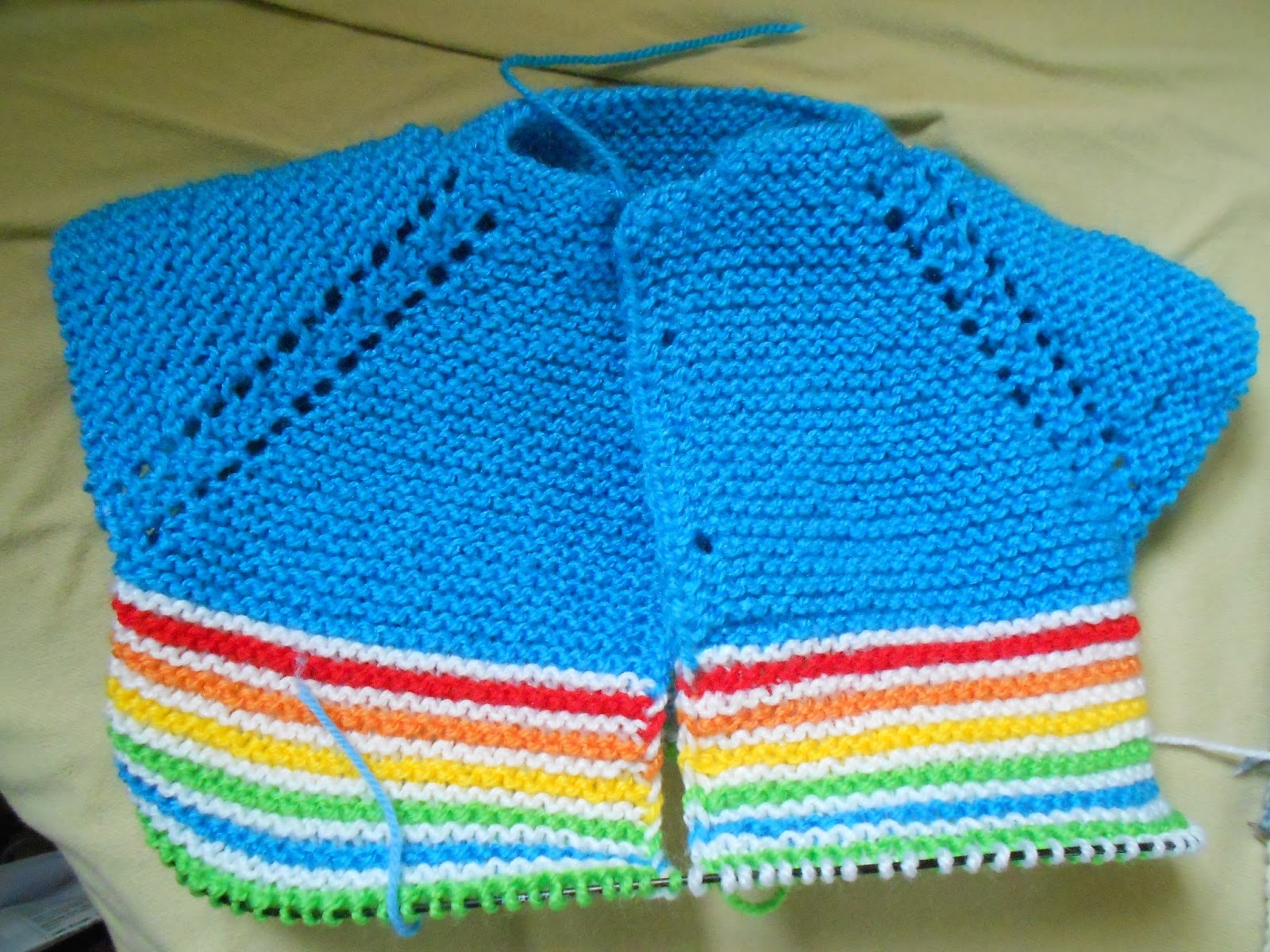 No último post perguntava-me se terminaria tudo o que tenho em mãos no que se refere ao crochet e tricot e por volta de à 2 dias atrás desmanchei a camisola de bebé que estava a fazer, o toque da lã não me estava a encher as medidas e depois comecei a achar o tamanho com pouca margem para crescer com o meu filho mais novo e depois comecei a achar uma camisola mais à homem e pouco bebé. Ao mexer nesta manta que fiz para ele gostei tanto do toque da lã e tenho tanta de sobra que decidi fazer um casaco alegre, muito alegre, talvez demais para alguns ! Com o aproximar do seu 1º aniversário ( ainda custa um bocado a acreditar como este ano passou tão rápido) este casaquinho é de certa forma uma oferta minha para ele, espero mesmo acabar antes do aniversário dele... O modelo é o Top Down Garter Stitch Baby Jacket. Nele fiz a alteração de ao invés de 1 botão, decidi fazer para 4.