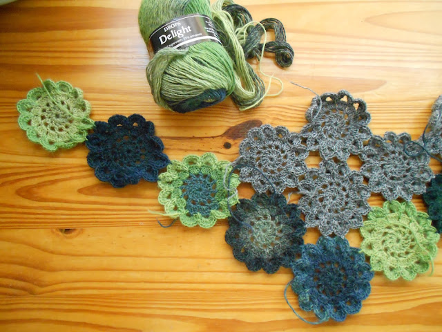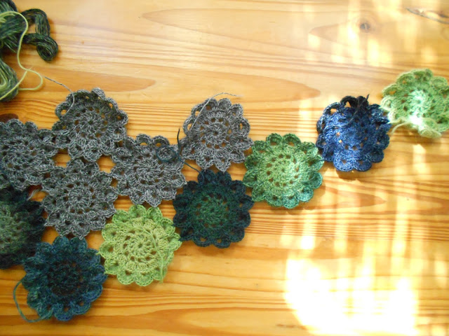 Hoje mostro-vos o que vos contei no último post, o xaile de flores japonesas com lã cinza e lã matizada em tons de verde e azul. Para contrariar o formato trapezoidal dos xailes com estas flores experimentei fazer o formato triangular, ainda que pouco acentuado, e acho que está a ficar bonito, depois da peça acabada e bloqueada acho que ficará ainda mais bonita.