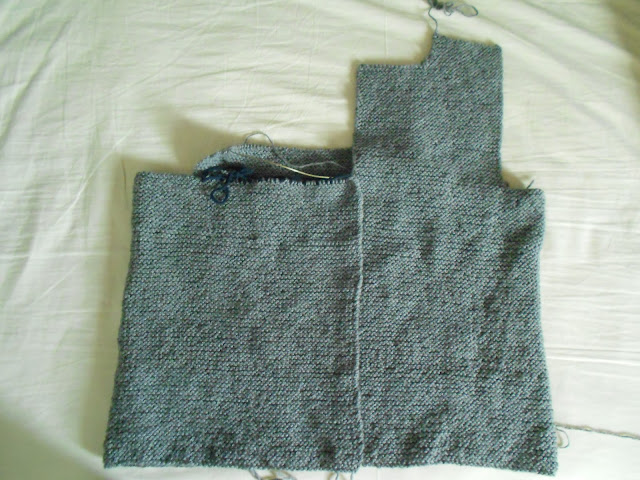 O casaco em ponto mousse para mim cresceu qualquer coisa, fi-lo um pouco mais comprido que o tamanho sugerido nas instruções e já estou a fazer o topo das costas e depois seguir-se-á o topo da lateral direita (onde farei as casas dos botões) e depois as mangas. Deu muito trabalho fazer crescer este casaco, o ponto não rende muito e fazer 200 malhas em cada carreira é um bocado aborrecido mas este modelo foi uma primeira escolha para fazer por ser a direito e sem demasiados detalhes que me podessem desafiar a mente menos atenta e até agora não tenho nada a apontar em negativo, só mesmo as instruções das mangas é que me parecem um bocado estranhas mas quando lá chegar verei.