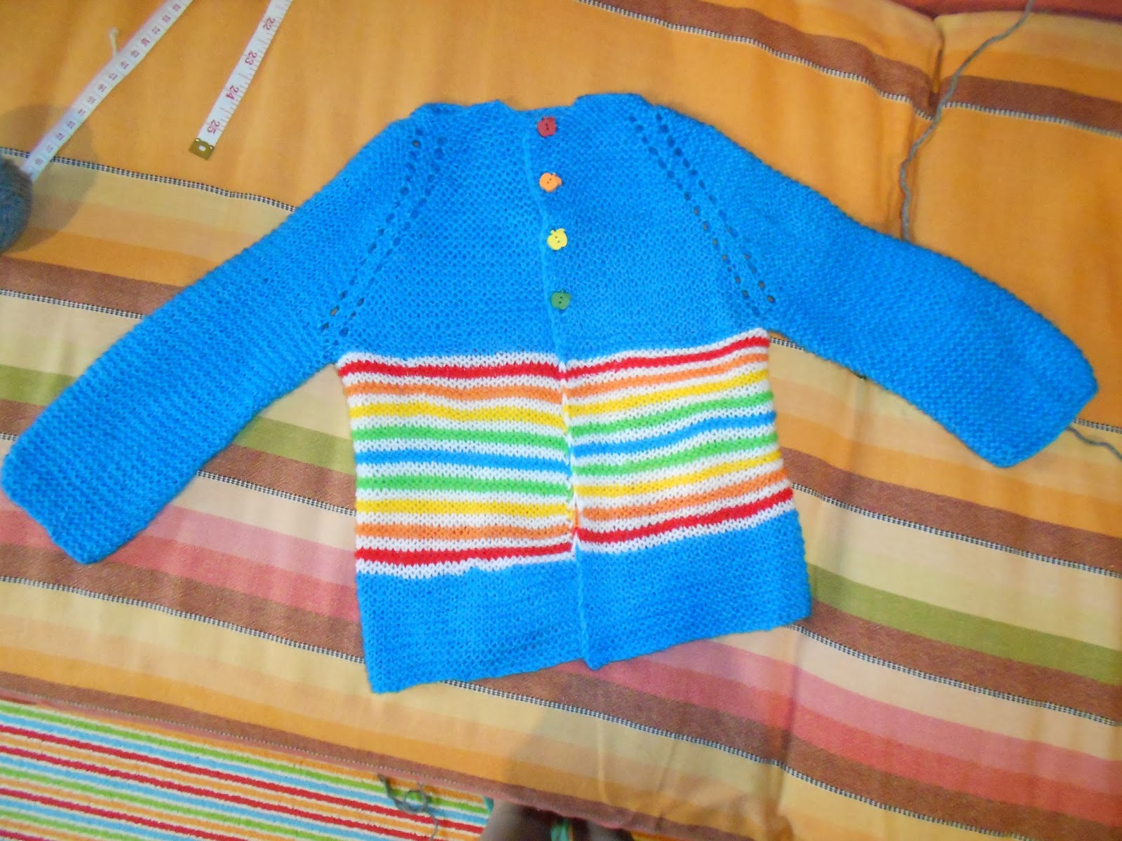 Outro trabalho que acabei foi o casaco para o meu filho mais novo. Fiquei desiludida pois o tamanho ficou justo. Tinha começado um casaco e com outro fio até mais fino e o mesmo estava com medida da amostra do casaco original e do que decidi depois fazer, depois mudei de ideias quanto ao fio e usei um acrilico, bem mais macio e acho que por deslizar melhor apertou mais, no entanto já ciente que isso podia acontecer usei agulha com 0.5m acima das que usei anteriormente. Ficou-lhe muito justo e curto (o mais estranho é que segui tamanho em medidas para 18meses) para não ter que desmanchar ( já tinha feito algumas costuras com agulha de ponta fina nas transições de cor do casaco) decidi bloquear a peça pois recordava-me que aquela lã bloqueada a vapor esticava bastante, agora já lhe serve, mas perdeu aquele ar encoprado do ponto mousse, as riscas estão mais visiveis mas nas primeiras costuras que fiz das riscas a malha não esticou como deveria e o meu pequeno ganhou uma casaco de andar por casa...