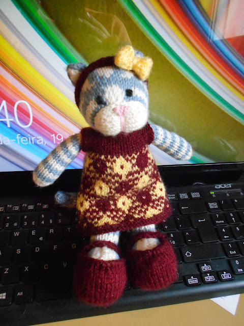 A minha pseudo girl cat - já que foi feita segundo as instruções do boy cat que comprei - 'nasceu' à alguns dias, mas só desde ontem tem a roupinha e adereços acabados. Adaptei as instruções das pernas para fazer os sapatos e fiz uma bandolete com lacinho para enfeitar (bem como para esconder uma imperfeição das transições de cor - devido a não manter tensão correcta do ponto - já que a cabeça foi a primeira parte que fiz. Mesmo em coisas para mim gosto de tentar esconder partes que menos gosto apesar de saber perfeitamente que elas estão lá. O vestido correu lindamente mas mais uma vez a parte da costura do vestido atrás e devido às ourelas imperfeitas na tensão não consigo ter um resultado que me agrade, no entanto será de desculpar já que o vestido foi feito a olho e sem recurso a instruções. Queria ter usado o bordeaux com rosa mas quando já tinha desistido de procurar pelo novelo perdido e depois de algumas carreiras com o amarelo encontrei mas não quis mais voltar atrás... Depois da gata estar vestida, o meu marido brincou comigo e disse que lá tenho que fazer outro bichano já que ando demasiado apegada à gata, só falta dormir com ela ;o)