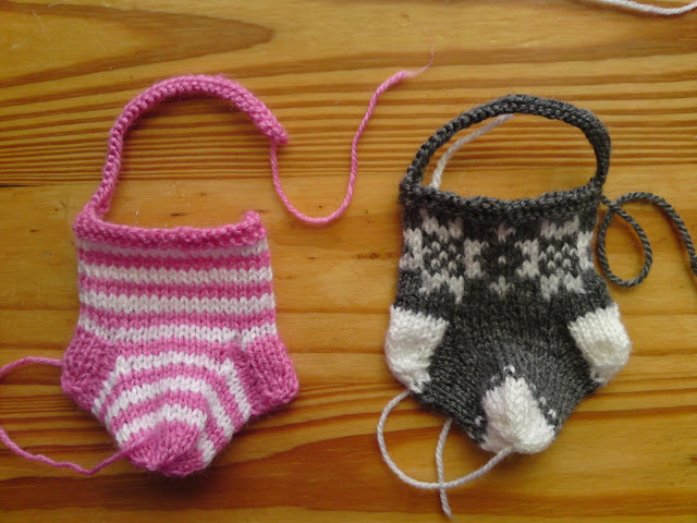 Ora ainda antes de concluir este gato fiz algumas meias, com algumas alterações às instruções para tornar a peça mais fácil de montar, aproveitando não apenas um ponto da presilha para pendurar, mas levantando mais outro e depois montar as malhas suficientes para depois com mais dois pontos levantados na outra ponta da presilha perfazer os 35 pontos necessários para a confecção da presilha. Na minha opinião a forma mais fácil mesmo é fazer às riscas, faço uma meia assim bastante rápido, já com os esquemas de desenhos para além de demorar um pouco mais nessa parte depois para a confecção dos calcanhares apenas numa cor e o resto do peito do pé noutra causa alguma confusão, posso dizer que para executar a meia cinzenta demorei um dia (no meio de outras tarefas): o cano foi bastante rápido ainda que com os desenhos mas depois do calcanhar para diante foi um faz e desmancha sem fim mas concluí. As meias às riscas num dia sou capaz de fazer umas 3, a vermelha em fair isle fiz numas 3 horas. Gostaria de fazer mais uma ou outra mais elaborada mas vou fazer mais às riscas. Algumas faltam costurar mas só depois de ter terminadas as que pretendo fazer é que vou começar as costuras.