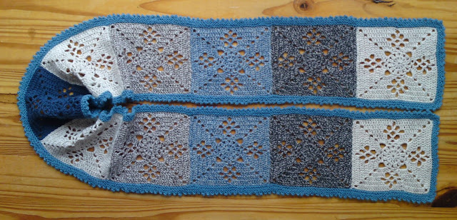 De uma manta (pelo menos era essa a intenção) os quadrados que tinha passaram a gola (usando apenas 3 quadrados) e a um cachecol que vos mostro hoje. Uni-los todos em crochet não me convencia, talvez seja uma fase, mas o tricot é a técnica que nestes últimos meses me tem cativado mais e foi por isso que decidi não continuar a fazer quadrados para fazer uma manta. Pensei logo num cachecol que sendo comprido dá para enrolar ao pescoço de muitas formas, uni os quadrados tal como fiz com a manta de estrelas que fiz para o meu filho mais velho, usando agulha de tapeçaria e pelo avesso apanhando os pontos da forma como mostro nas imagens seguintes. Depois comecei a árdua tarefa de levantar malhas com a lã que decidi usar para o bordo, digo árdua porque foram muitas e até ver qualquer coisa a crescer passaram-se muitos dias. Foi um trabalho feito pela calada, com a intenção de acabar mas sempre com a suspeita de vir a ser encostado e esquecido. Mas não foi e ainda bem que assim foi.
