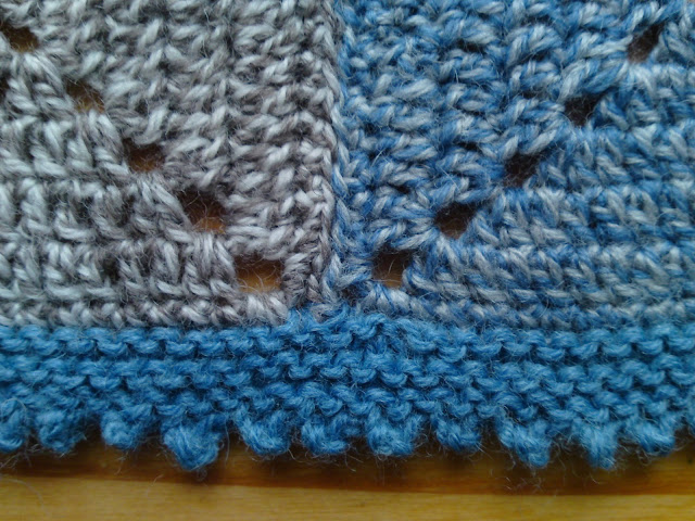 Quanto ao bordo já não me recordo bem do nr de carreiras que fiz em ponto mousse (garter stitch) antes do picot que nada mais é que o remate do trabalho, mas a passo muito lento. Mas recordo-me que comecei montando 2 malhas extra às que tinha na agulha da esquerda usando Knit-on cast on (ou montagem tricotada, tal como a Sofia Carneiro menciona) que nada mais é que fazer uma malha em meia com a agulha direita e, sem tirar da agulha dar uma ligeira torção ao inserir na agulha da esquerda, essa malha será usada para a próxima malha a adicionar. Logo em seguida é feito o remate (cast off ou bind off já que significam a mesma coisa) de 3 malhas em meia e no último remate voltar a colocar a malha da agulha da direita para a da esquerda e essa malha irá formar uma nova malha com o knit-on cast on e depois essa irá dar origem à segunda malha e continuar a rematar 3 malhas repetindo asim: montar 2 malhas, rematar 3,montar 2 malhas, rematar 3 e assim sucessivamente.
