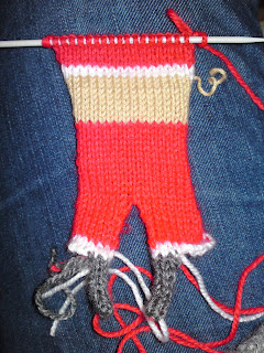 para terem uma ideia de como fiz os bonecos: comecei 2 i-cord para cada bota e depois mantendo as malhas do icord fiz montagem de malhas para as pernas/fato, mudando de cor para a cara e o gorro. Depois de rematado com o fio por entre as malhas, costurei com o mattress stitch e quando estou na zona do pescoço enrolo o fio da costura à volta para dar formato da cabeça e continuo a costura por aí abaixo. Faço mini pompons com lã branca que ora faço passar por dentro do boneco e faço sair pelo topo da cabeça, deixando alguma lã de fora e depois dou forma com a tesoura. Bordei as feições do rosto e terminado ;o) O último boneco foi o mais fácil de fazer, já estava bem treinada ;o)