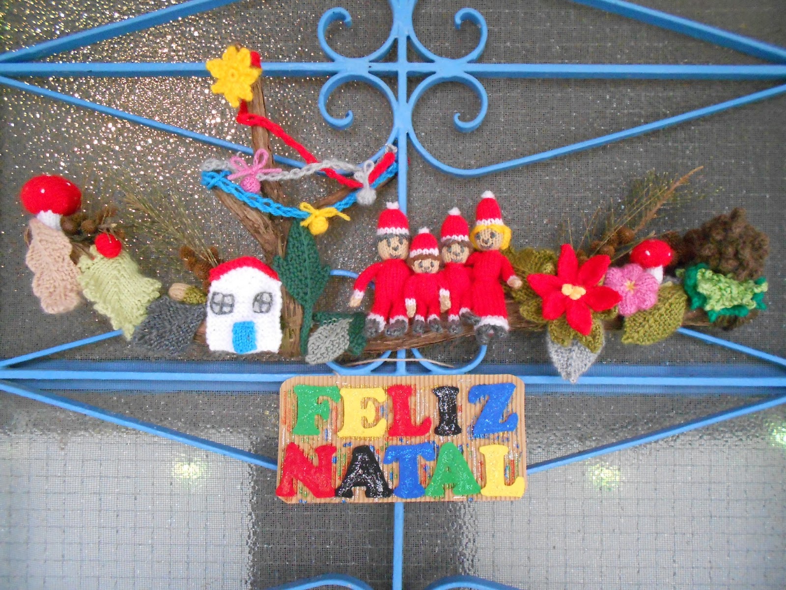 Terminei de vez e cada vez que entro em casa (e não é por esta porta, apesar de ser a que está de frente para a entrada) é esta imagem que vejo e sorrio sempre ;o) Foi sem dúvida um bom passatempo e uma experiência a repetir futuramente. Continuo a dizer que fazer estas peças é super fácil, utiliza-se os pontos mais básicos do tricot e a brincar fazem-se formas muito engraçadas que muitos acham que só se conseguiriam fazer em crochet. De todas as peças que compõem esta decoração a casa é a que menos me enche as medidas, foi improvisada e ficou muito tosca, quem sabe para o novo ano faço uma mais perfeitinha ;o) Sempre fiz as letras do 'Feliz Natal' mas como o tempo e a disposição têm diminuído (vicissitudes da vida, doença pela milésima vez desde Outubro do meu filho mais velho) optei por recortar feltros e colá-los em cartão e decorar com cola de brilhantes.