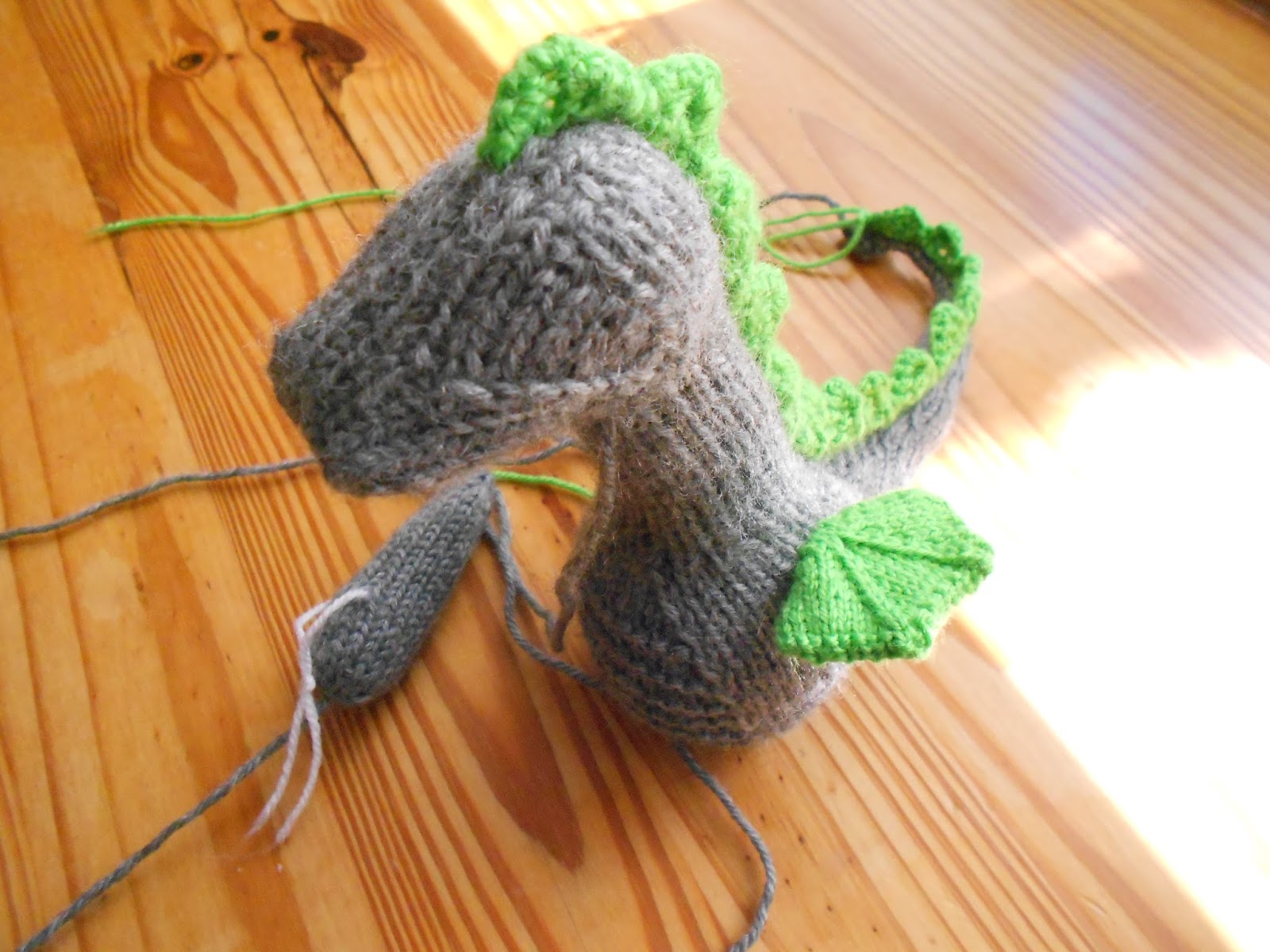 Existem pois! Na semana passada recebo uma nota da educadora do meu filho mais velho a comunicar sobre uma troca de presentes entre colegas que não custassem mais que 3 euros e logo no momento que li pensei que seria uma boa oportunidade de fazer uma prenda ao invés de comprar. E depois o que faria? Comecei a pensar que a tarefa iria ser complicada já que teria que servir para menino ou menina, não saberia a quem iria sair o que fizesse. Tinha em vista fazer um boneco das instruções Anything Animals (de Rachel Borello Carroll) tinha alguns por onde escolher, mas depois pensava se teria as cores mais indicadas para os fazer e achava mais piada às bonecas-menina do que fazer os animais... queria algo mais unissexo. Depois da mesma autora das instruções de alguns elementos decorativos da decoração natalícia que fiz, achei piada aos The Plumps, de Frankie Brown, mas ainda assim achava que não era bem isso que eu queria para a troca de presentes. E depois numa visita a um blog que sigo, o Marinoie vejo um trabalho que a autora do blog fez, acho que pela segunda vez, e na altura do primeiro post achei uma graça ao Tarragon the Gentle Dragon, achei-o tão perfeitinho em detalhes. Ora pois foi um dragão que fiz. Achei ainda mais piada ao boneco porque na página do Ravelry as imagens do mesmo era em tons de rosa, lilás, azul mas em casa não tenho muita variedade de cores em fio mais espesso então optei pelo cinzento e depois escolheria a cor dos outros elementos. Pensei em fazer multicoloridos mas depois não gostava do efeito em tricot e optei por um verde que tenho, bem ofuscante por sinal e depois de ter costurado as asas do dragão é que me lembrei que o verde não é igual mas é muito próximo da tonalidade de verde escolhido para alguns adereços da roupa dos colegas da escola do meu filho.