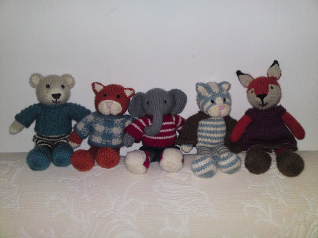 Temos Toby ;o) Experimentei as instruções da camisola do boy elephant da Julie williams e adorei ! Fiz os calções às riscas. Improvisei na barriga, orelhas e cauda do urso usando uma segunda cor, a mais clara tal como usei no focinho. Os olhos fi-los com a adaptação do anchored french knot, tal como tenho vindo a aplicar nos botões das roupas dos bonecos. Não desgostei de fazer uns olhos maiores, estes com toda a certeza não se afundam no tricot, quando com o nó original das instruções por vezes isso acontece.